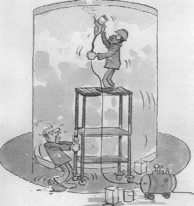 Durum: “Üstteki işçi” boya tabancası ile bir tankı boyuyor.Bunun için tekerlekli bir iskelenin üzerine çıkmış.”Alttaki işçi”de sanki hareket ettirmek istermişçesine iskeleye asılıyor.